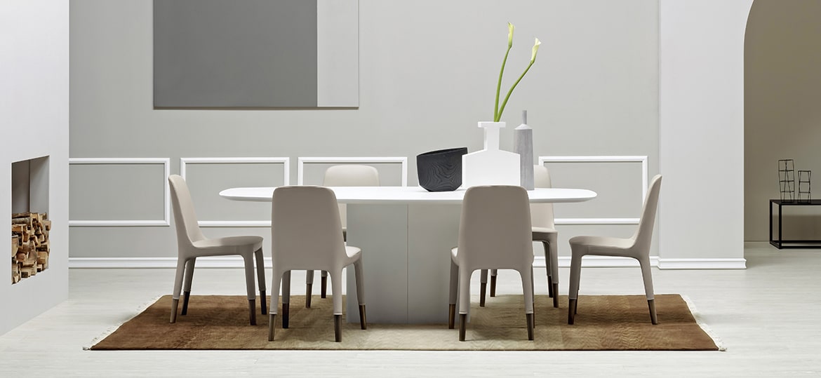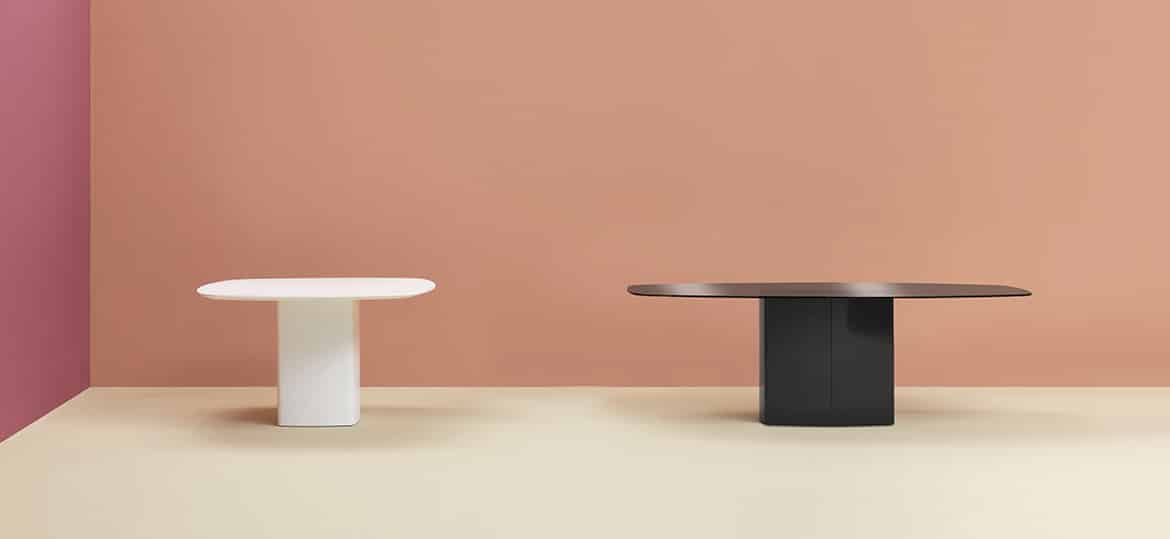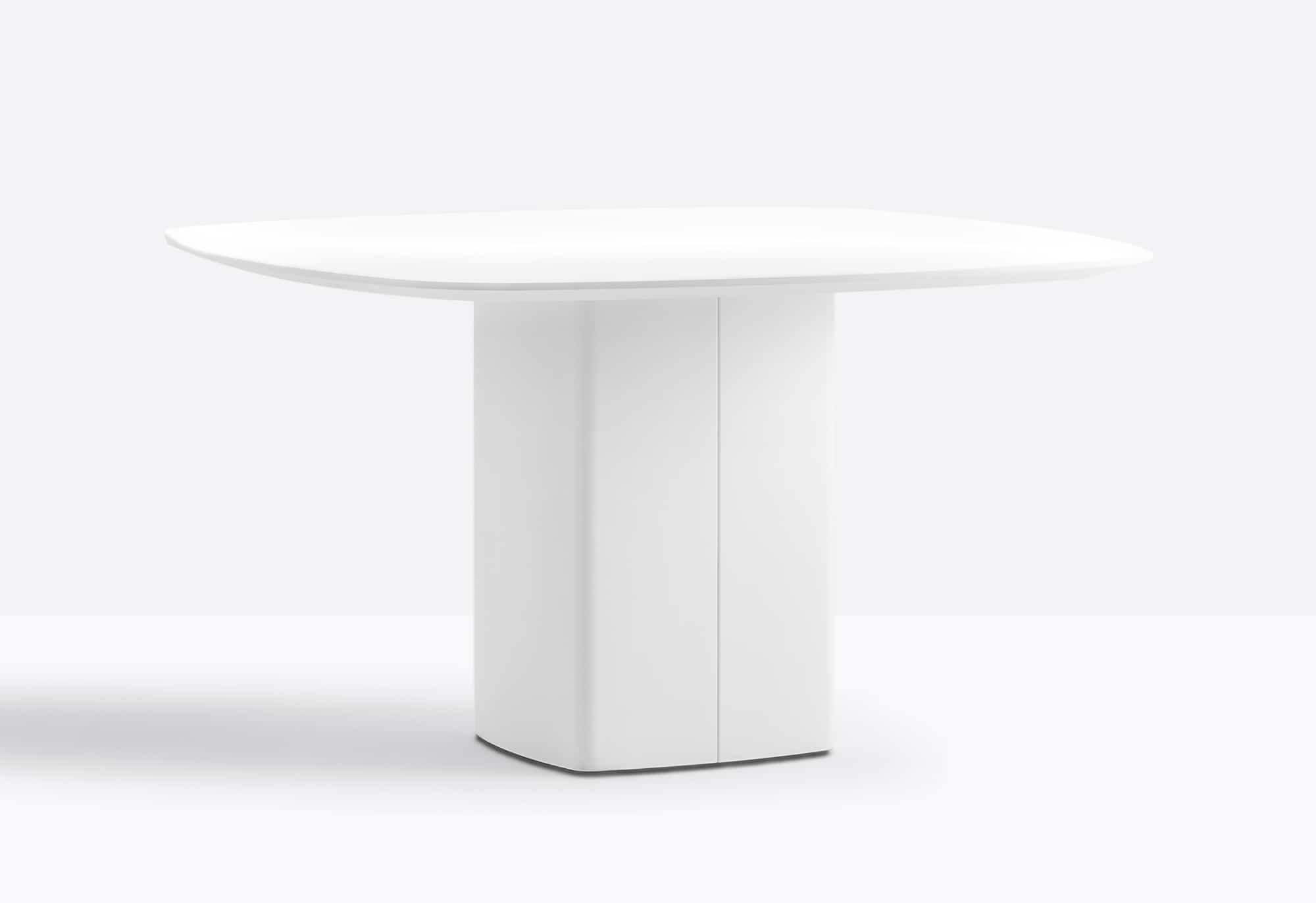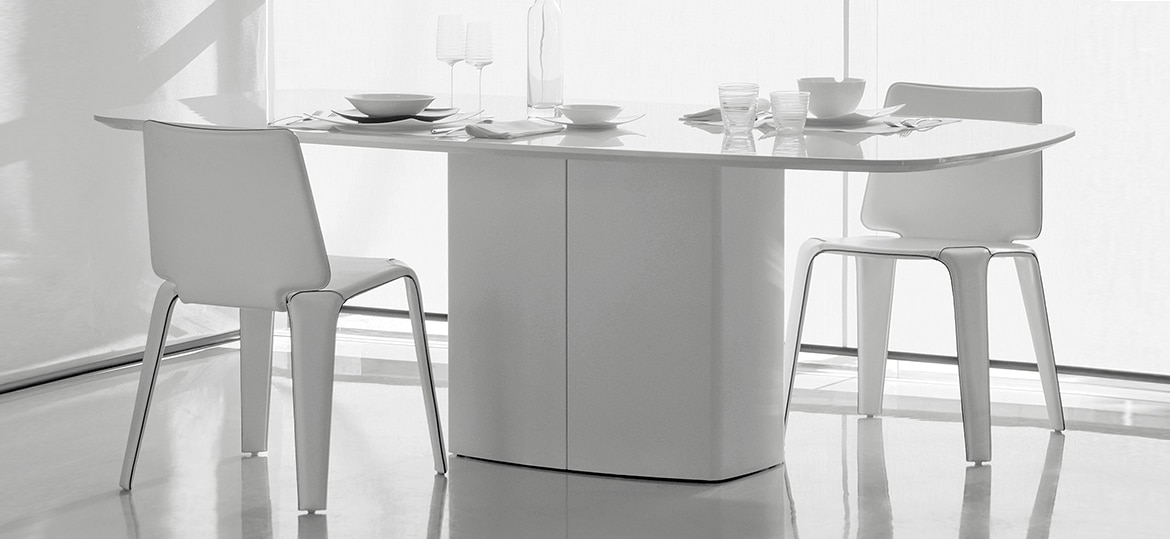 Aero is a table with generous dimensions, simple in appearance but with a strong character. A steel cover splitted in two shells hides a central square base with rounded corners combined with a refined glass or solid laminate top.