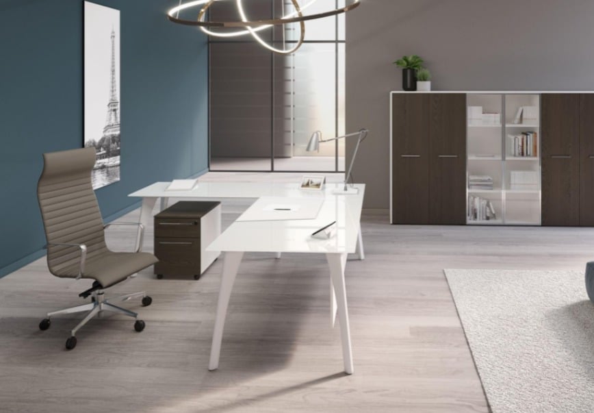 Active is much more than an executive, it is an authentic program with a combination of shapes, geometry, finishes, colours and materials, making it possible to achieve creative layouts. A modern interpretation of the styles demanded by the marketplace for entry level executive furnishing. The distinguishing feature of the collection is the elegant polished aluminium profile which brightens the 45° joint between tops, the same brightness that can be found in the chrome details and which provides an eye-catching contrast with the matt surface finishes, or which are reflected in the glass tops. This is a collection thought to match the client needs, enriched with chairs and sofas, coordinated with accessories in leather with traditional hand finish.