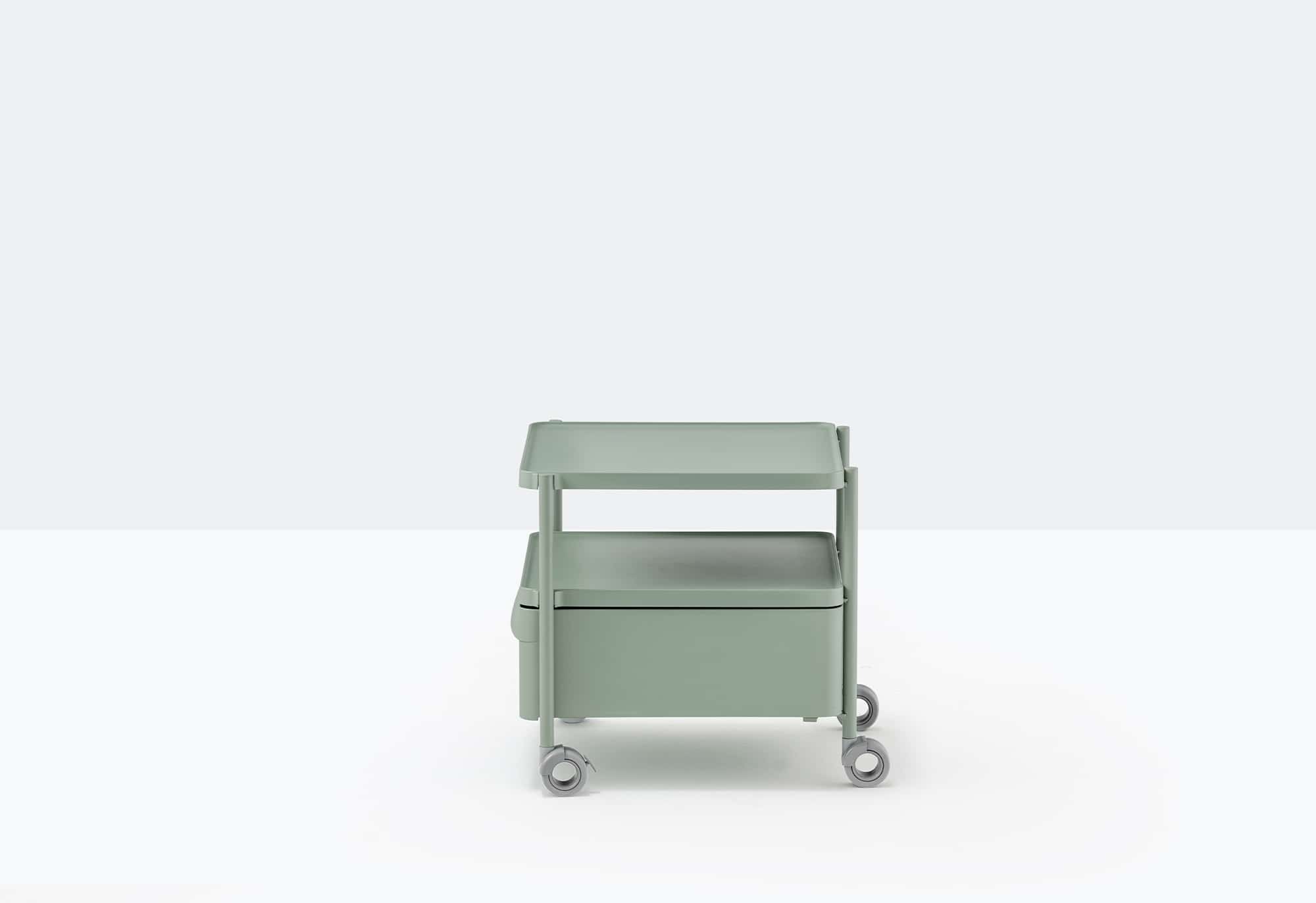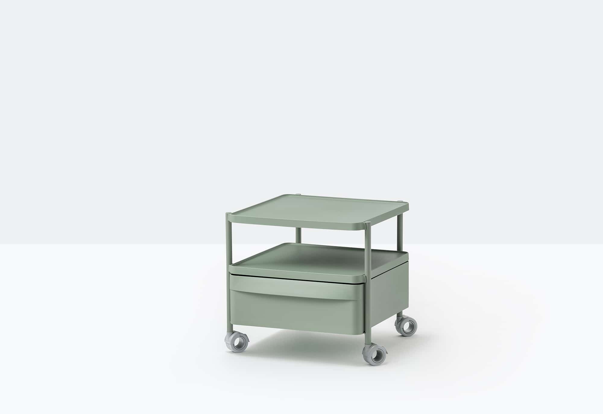 Boxie is a storage system by minimal and essential lines, remarkable for its lightness which is guaranteed by a coated steel frame equipped with drawers alternated with tops, both made in polypropylene. System equipped with three drawers, fitted with an integrated handle, and swivelling and lockable wheels.
