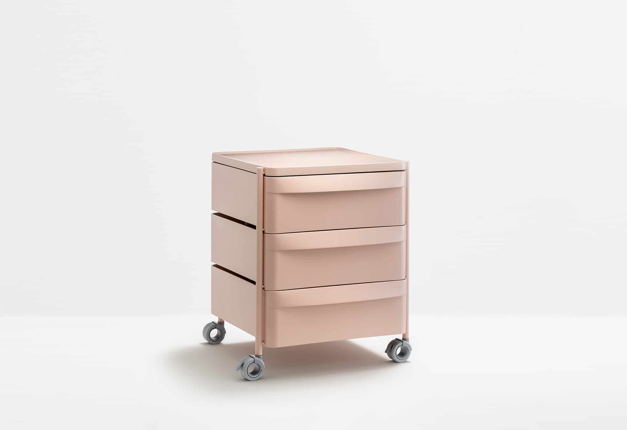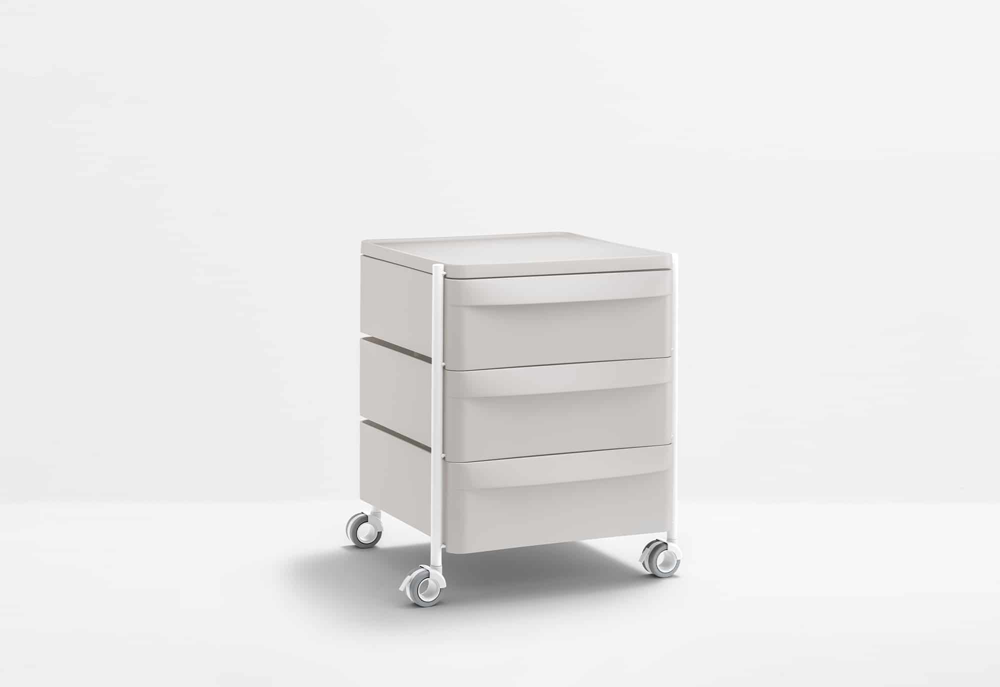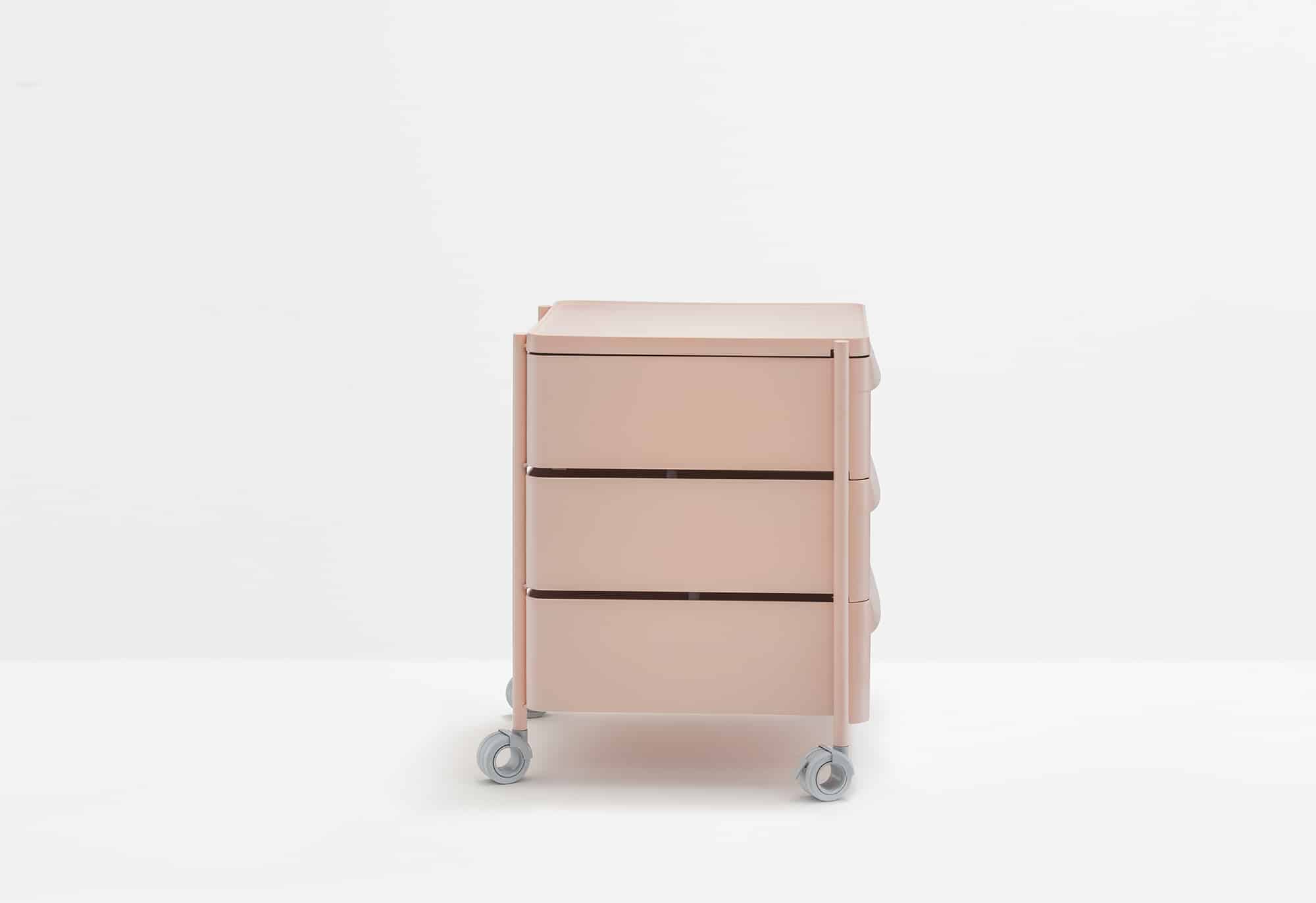 Boxie is a storage system by minimal and essential lines, remarkable for its lightness which is guaranteed by a coated steel frame equipped with drawers alternated with tops, both made in polypropylene. System equipped with three drawers, fitted with an integrated handle, and swivelling and lockable wheels.
