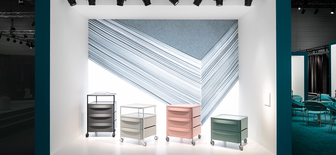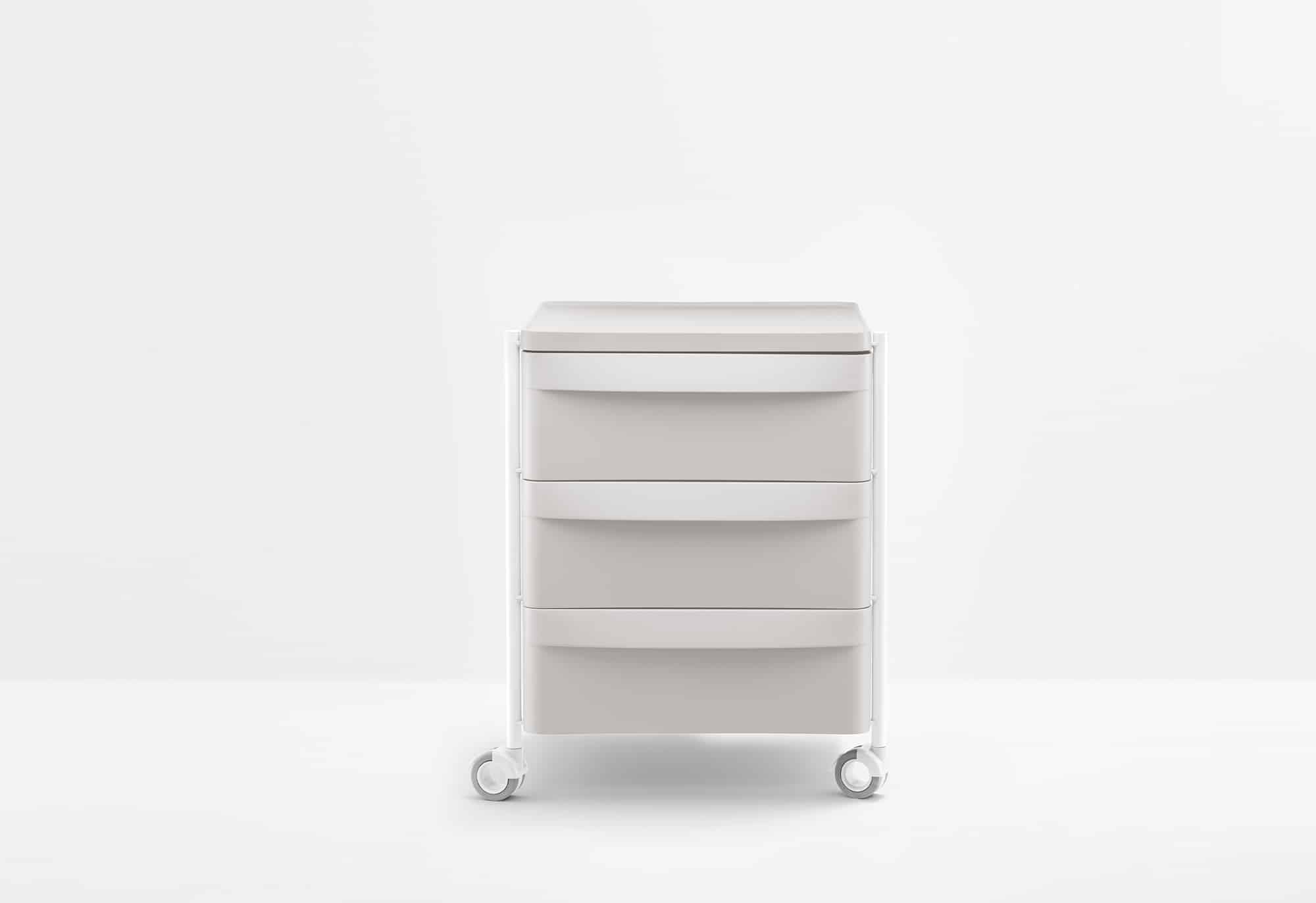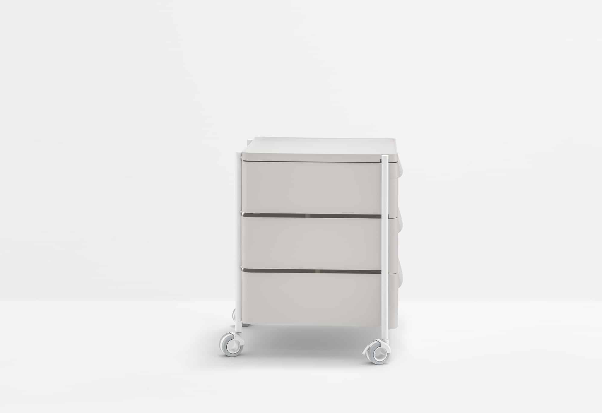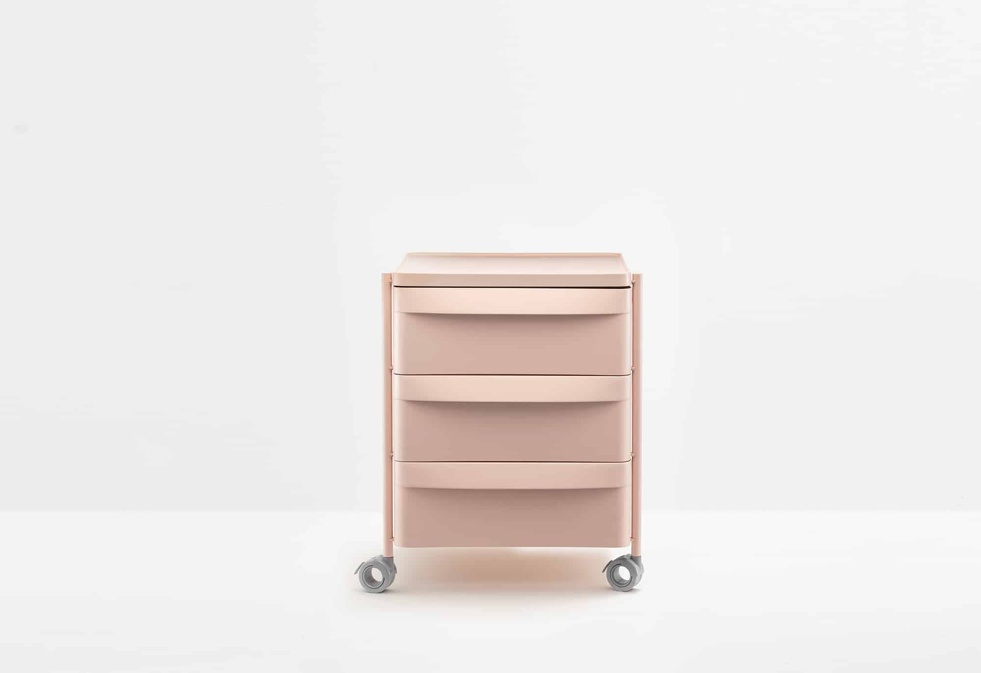 Boxie is a storage system by minimal and essential lines, remarkable for its lightness which is guaranteed by a coated steel frame equipped with drawers alternated with tops, both made in polypropylene. System equipped with three drawers, fitted with an integrated handle, and swivelling and lockable wheels.