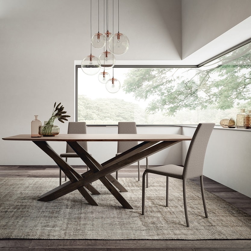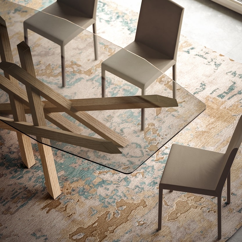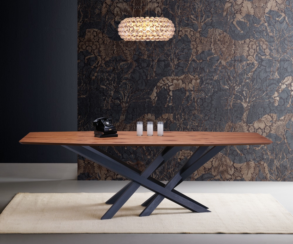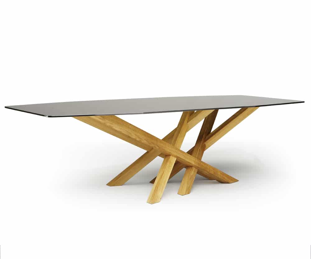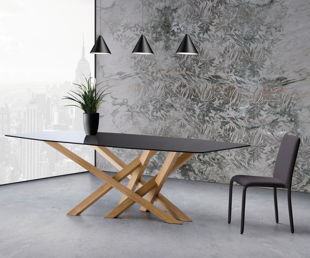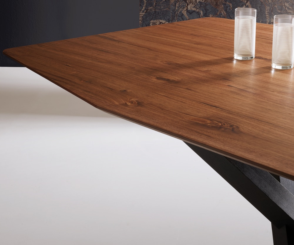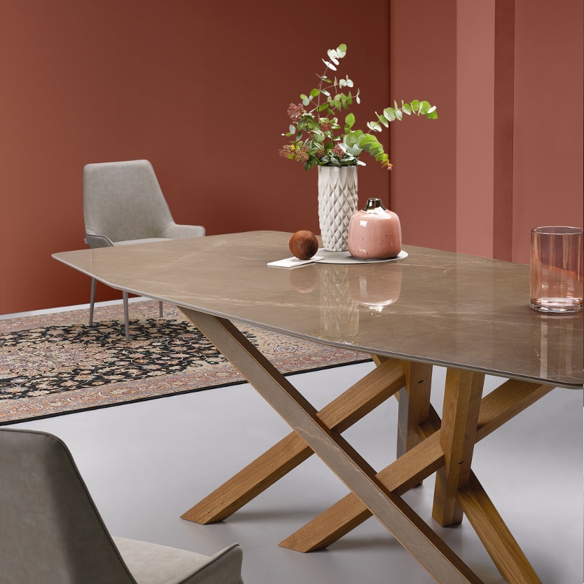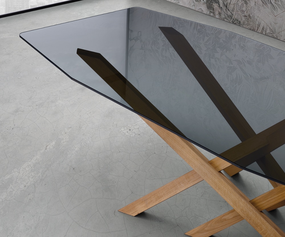The unusual outline of the veneered top, also available in glass and gres, defines the eye-catching elegance of this table and is effortlessly combined with the strong statement made by the oak frame in a variety of finishes. The distinctive element of the table is the particular shape of the frame, embellished on request by a stoneware insert.