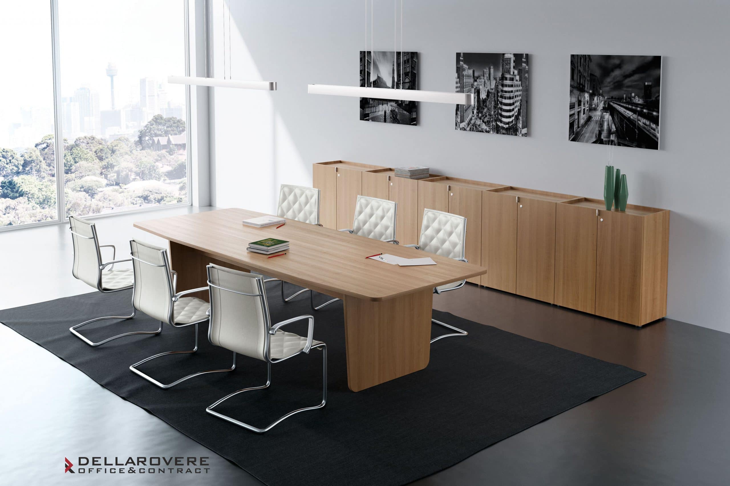 Della Rovere proposes Meeting table designed especially for you. Materials, shapes, dimensions, accessories and legs may be modelled around your company to furnish your Meeting table rooms just the way you want them. We realise your ideas and personalise the Meeting Rooms of your dreams: futuristic, essential, classic and functional. Choose the world of Della Rovere, choose UniMeeting meeting table. The new UniMeeting collection is the result of Della Rovere’s consolidated experience over the years in the world of Office Furniture: the transversal solution to the Della Rovere collections that proposes functionality, design and elegance in the Meeting Rooms. Already in the Research and Development phase we decided to create personalisable writing desks, to give a wide selection of materials and to solve the daily furnishing problems thanks to a vast selection of shapes, colours and the modularity of the tops. Today, different options come together for a result which is always elegant and never banal. Thanks to the furnishing we propose, the Meeting Room becomes a pleasant meeting place with an essential, geometric style, a pure symbol of professionalism. The large tops are supported by solid bases harmonious in form and with great visual impact. It’s easy to be instantly operative: a click opens the cabling system panels. Functionality is always supported by the beauty of the materials and the equilibrium of a simple and elegant design which does not pass unobserved. The choice of valuable details is a symbol of added value which gives the Meeting Room importance and comfort. Curved, ergonomic, designed for various functions, UniMeeting combines natural materials with technological materials for an aesthetic result that bespeaks classic modernity.