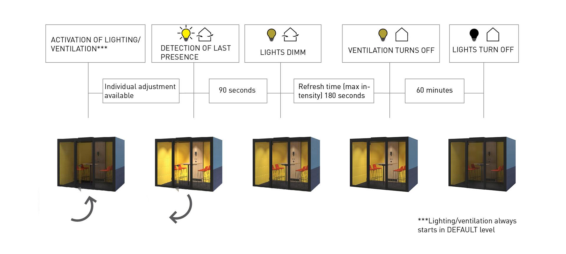 Thanks to its air ventilation and lighting solutions, SILENT ROOM offers a productivity-boosting environment. The ten high-capacity ventilators ensure a proper air flow rate (500 m³/h) and their low operating noise is just as quiet as the sound of leaves rustling. The combination of the six LED lamps creates a warm and homely atmosphere. A smart control unit selects an optimal ventilation and illumination level, and, if necessary, allows for individual adjustment. Once an employee leaves the SILENT ROOM, intense ventilation is automatically activated to prepare the room for the next user. This acoustic piece of furniture also helps with energy savings as it automatically dims the lights when no one is present in the room and even switches them off after some time.