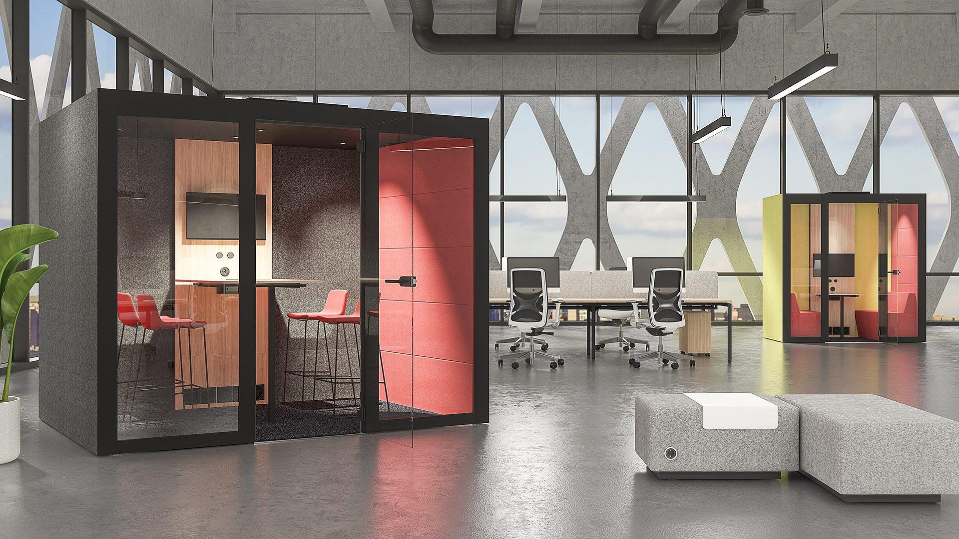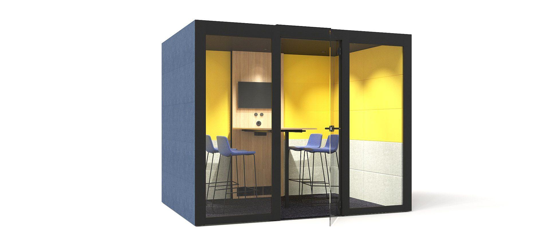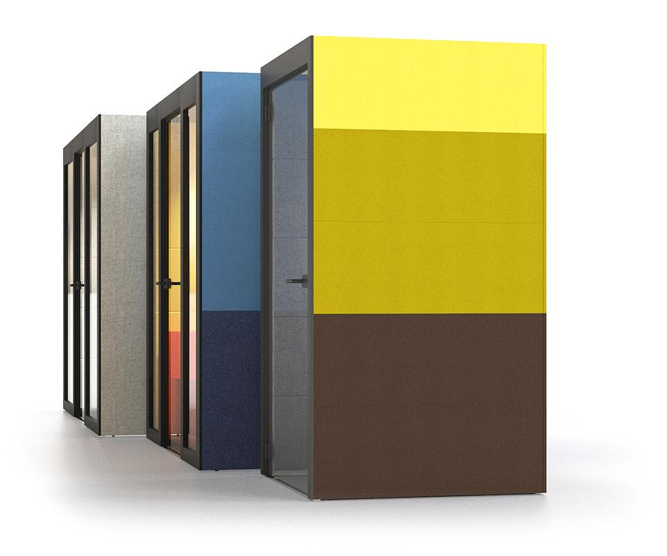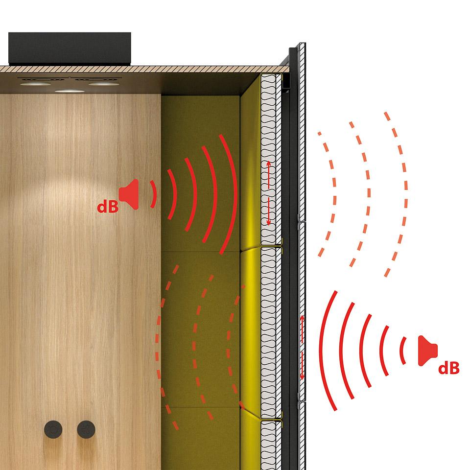 Multilayered SILENT ROOM wall structure, hermetic door and ceiling ensure sound insolation. The inner layer of the panels is made from high-class acoustic material that eliminates echo and has excellent sound absorption properties. The upholstered exteriors block out noise effectively and create an acoustically-optimised working environment.