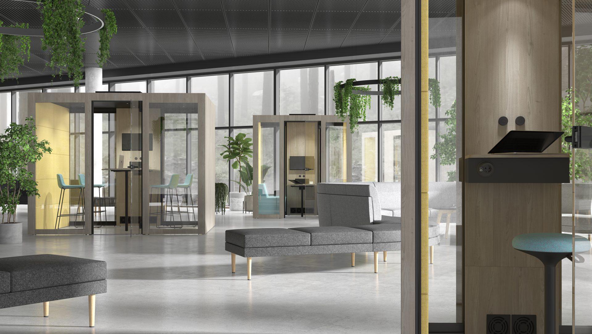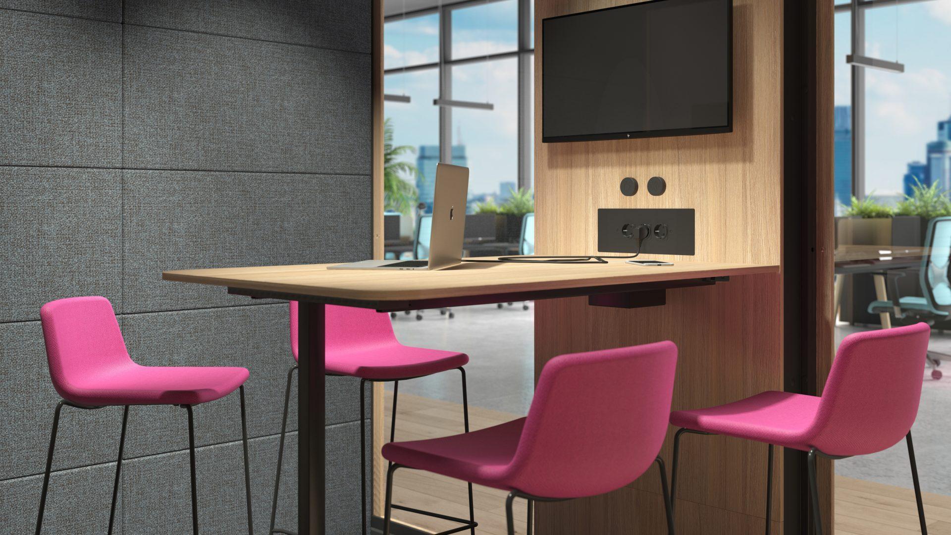 Getting in and out of the SILENT ROOM is easy: a low doorstep and same level floor ensures that no caution is needed while stepping inside. Measuring 2,548 mm in width, 1764 in depth and 2,150 in height, SILENT ROOM ensures a high level of comfort and allows for a wide range of freedom. It can be also easily adapted to a variety of activities. The 10 m³ SILENT ROOM space provides you with the freedom to create a personalised setting that suits your needs best. Choose a regular or a high table for your team meetings or important business meetings or a coffee table that can easily fit four people for casual get-togethers. Your important conversations or presentations will not be ended abruptly when your device battery dies since there is an option of installing a socket or a 3-plug power block in the media wall of the acoustic pod. The power block can come with in-built sockets, LAN or USB ports in various configurations for added user convenience.