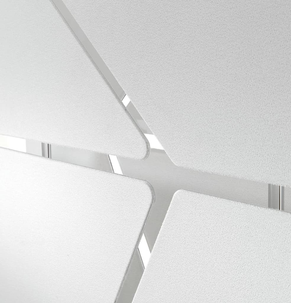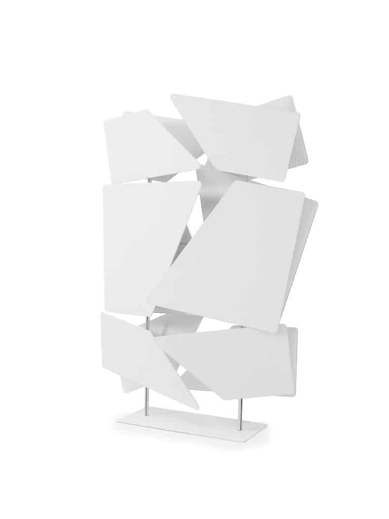 Divider made up of 12 Flat panels set against each other and supported by a chromed tubular steel structure mounted on a painted metal base. The panels, characterized by the plane front surface, can be tilted and rotated.