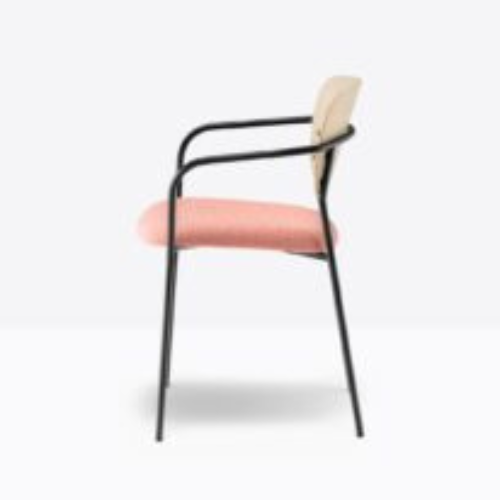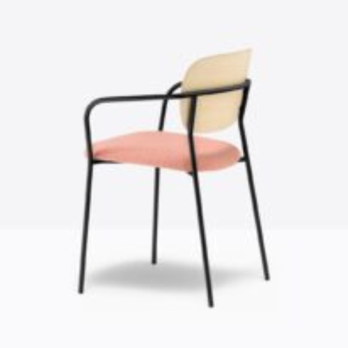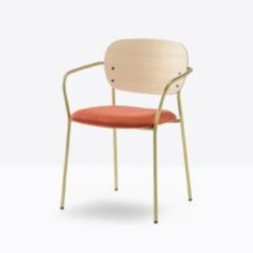 כסא Jazz עם ידיות, מושב מרופד ומשענת גב מדיקט עץ אש, המופרדים על ידי פתח פונקציונלי, מעניקים תמיכה נוחה לצד מראה קליל ומודרני. מסגרת הפלדה הדקה מוסיפה יציבות תוך שמירה על קווים נקיים ואלגנטיים. ניתן להתאים את הכסא באופן אישי עם מגוון רחב של ריפודים מבד או מעור, לצד גימורי פלדה ומשענת בגוונים שונים – מציפוי מתכתי ועד צבע לכה המדגיש את מרקם העץ.