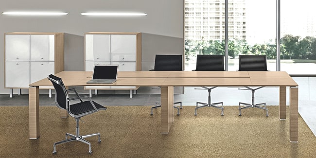 A timeless elegance that encompasses the working environment even in compositions with articulated shapes.