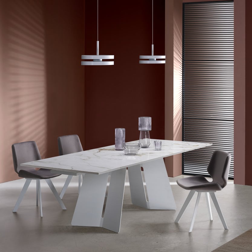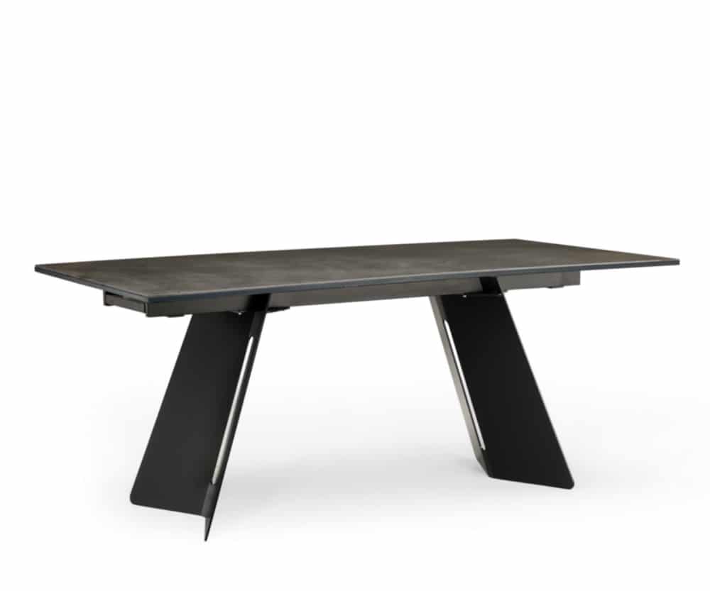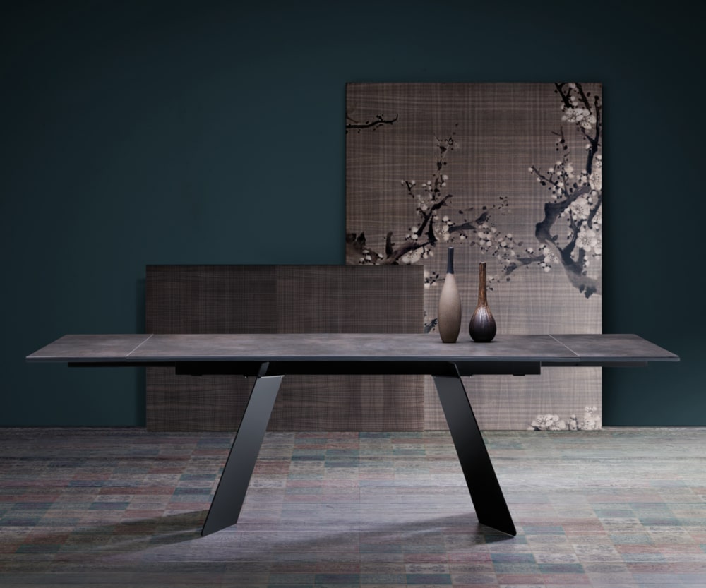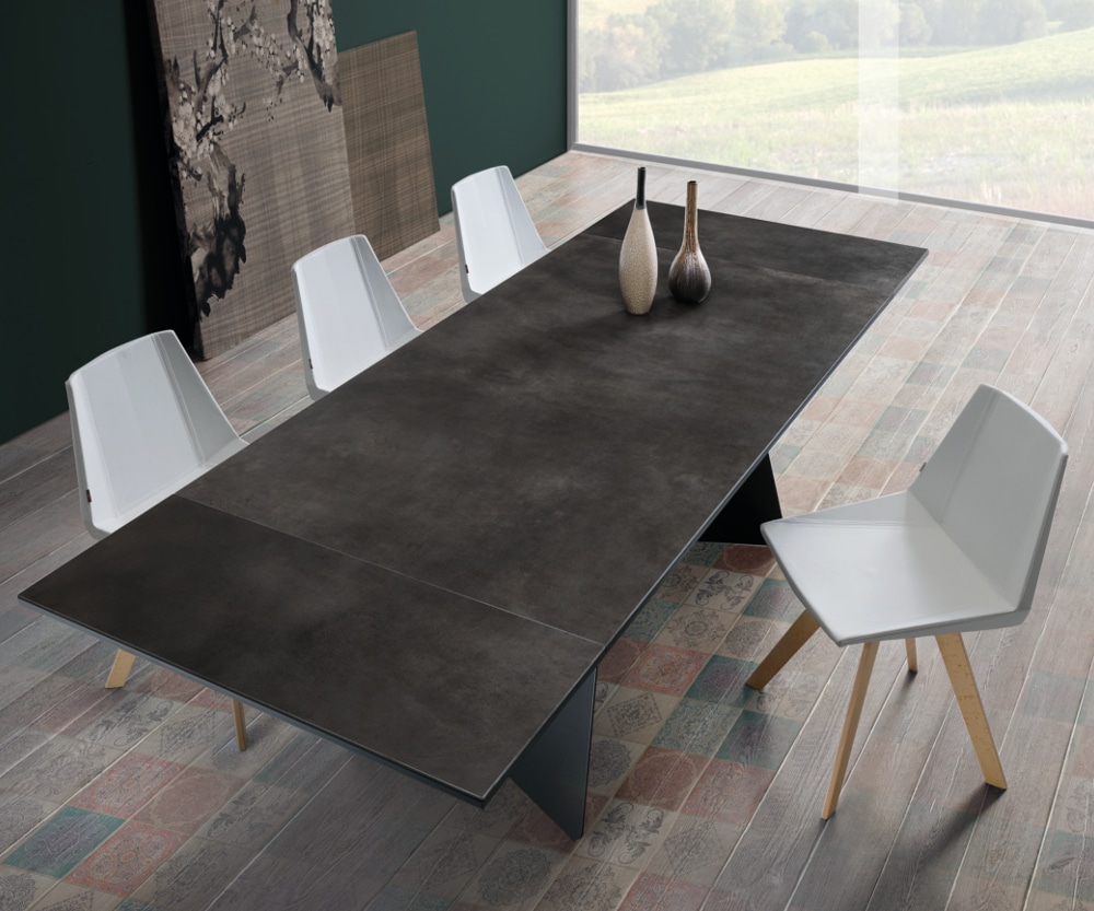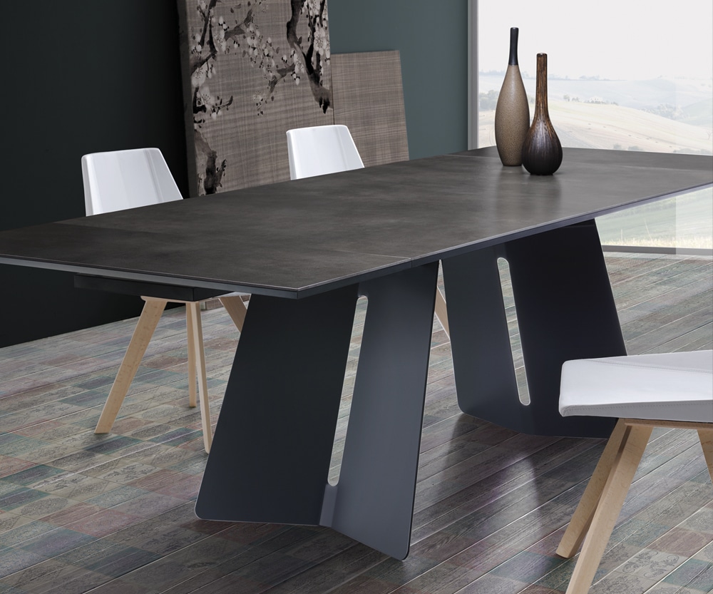 The rectangular top rests on the imposing metal base with an original variation in porcelain stoneware. An easy-to-extend, clean-lined, modern table.