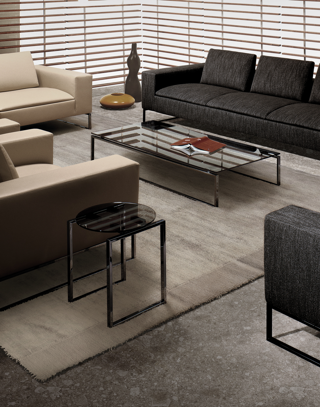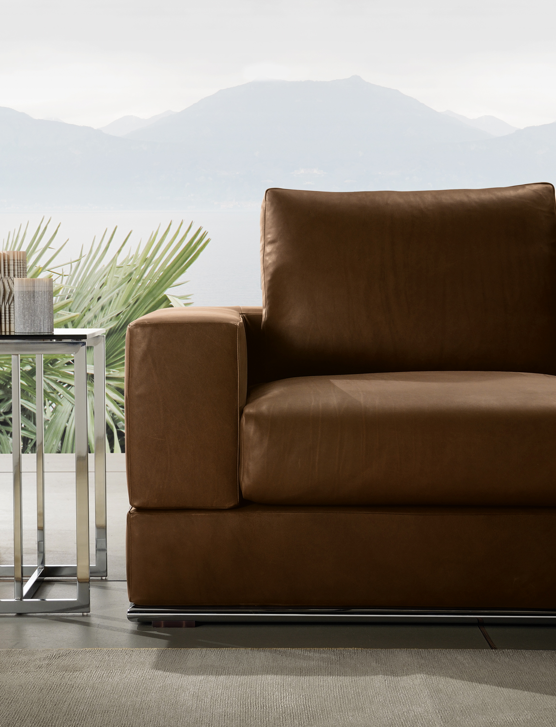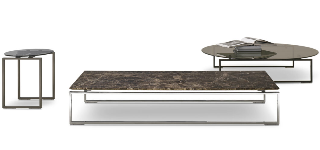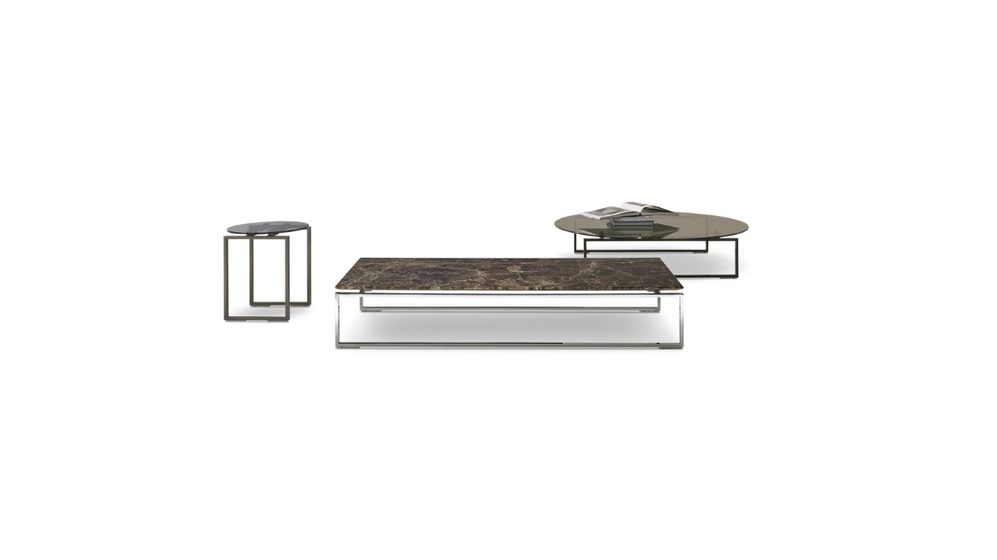 שולחן קפה דגם Kubico מגיע במגוון צורות וגדלים, זמין עם משטח עשוי פאנל מצופה מלמין המכוסה בעור אוכף, זכוכית מחוסמת מעושנת או שיש.