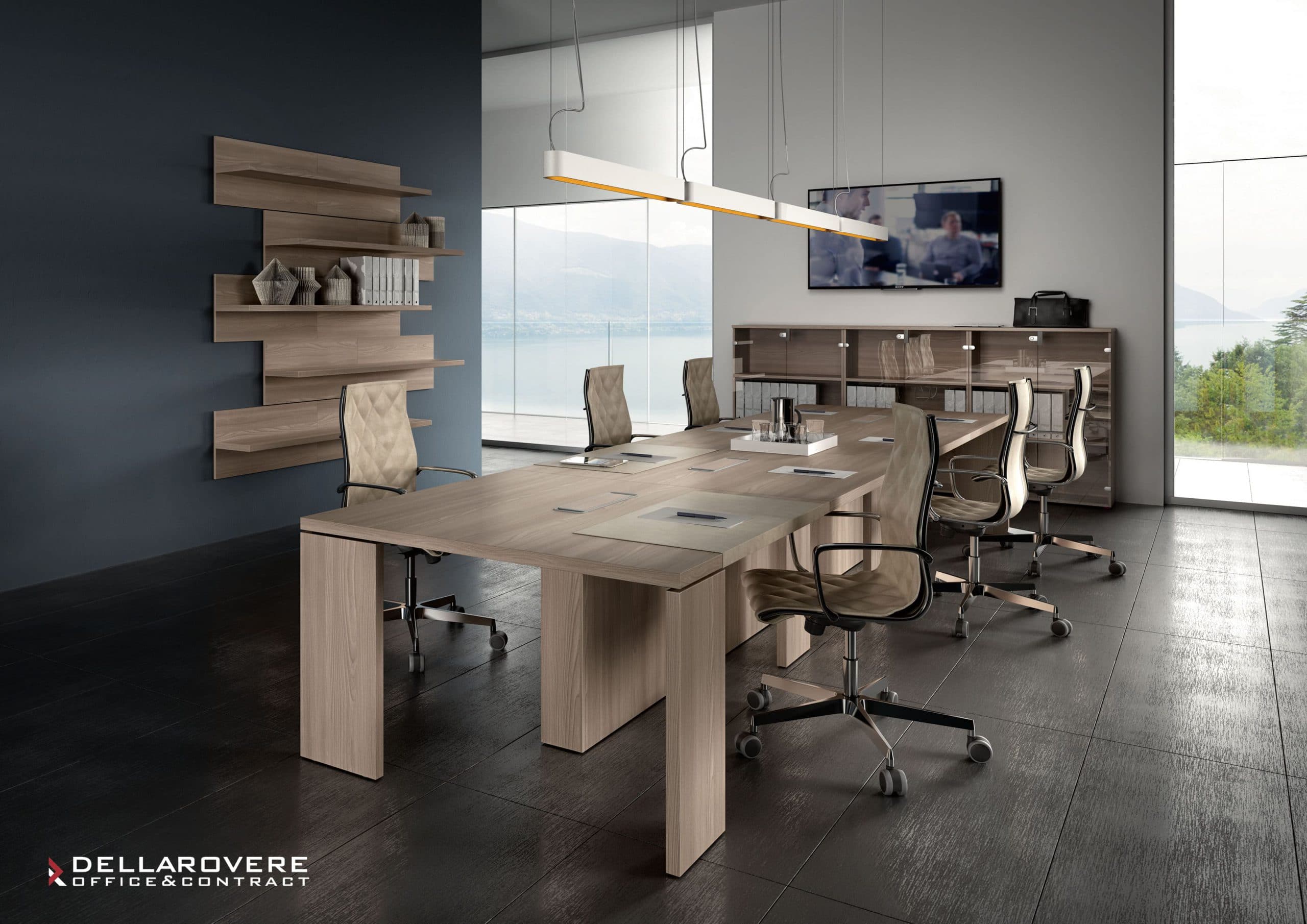 Della Rovere proposes Meeting table designed especially for you. Materials, shapes, dimensions, accessories and legs may be modelled around your company to furnish your Meeting table rooms just the way you want them. We realise your ideas and personalise the Meeting Rooms of your dreams: futuristic, essential, classic and functional. Choose the world of Della Rovere, choose UniMeeting meeting table. The new UniMeeting collection is the result of Della Rovere’s consolidated experience over the years in the world of Office Furniture: the transversal solution to the Della Rovere collections that proposes functionality, design and elegance in the Meeting Rooms. Already in the Research and Development phase we decided to create personalisable writing desks, to give a wide selection of materials and to solve the daily furnishing problems thanks to a vast selection of shapes, colours and the modularity of the tops. Today, different options come together for a result which is always elegant and never banal. Thanks to the furnishing we propose, the Meeting Room becomes a pleasant meeting place with an essential, geometric style, a pure symbol of professionalism. The large tops are supported by solid bases harmonious in form and with great visual impact. It’s easy to be instantly operative: a click opens the cabling system panels. Functionality is always supported by the beauty of the materials and the equilibrium of a simple and elegant design which does not pass unobserved.