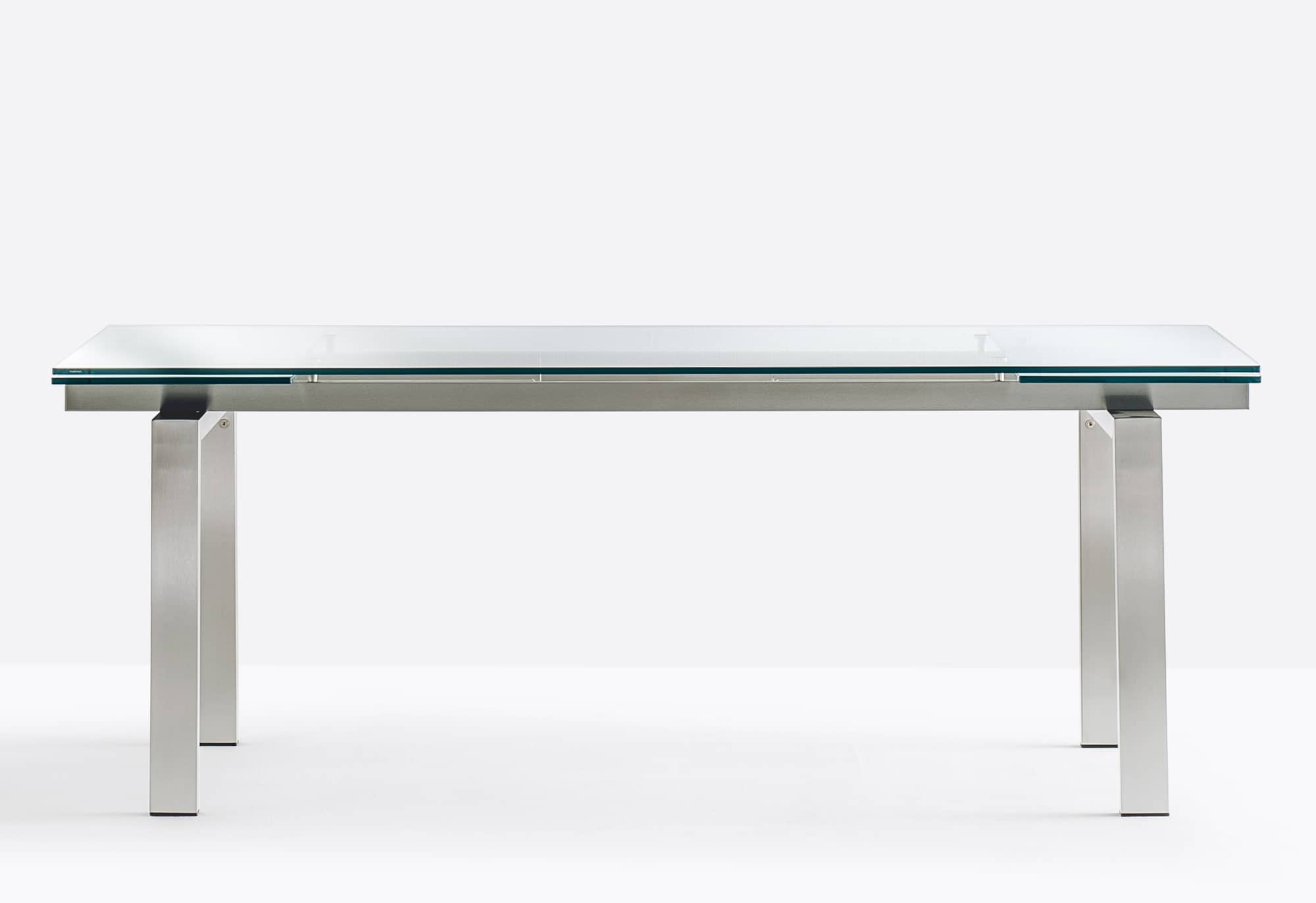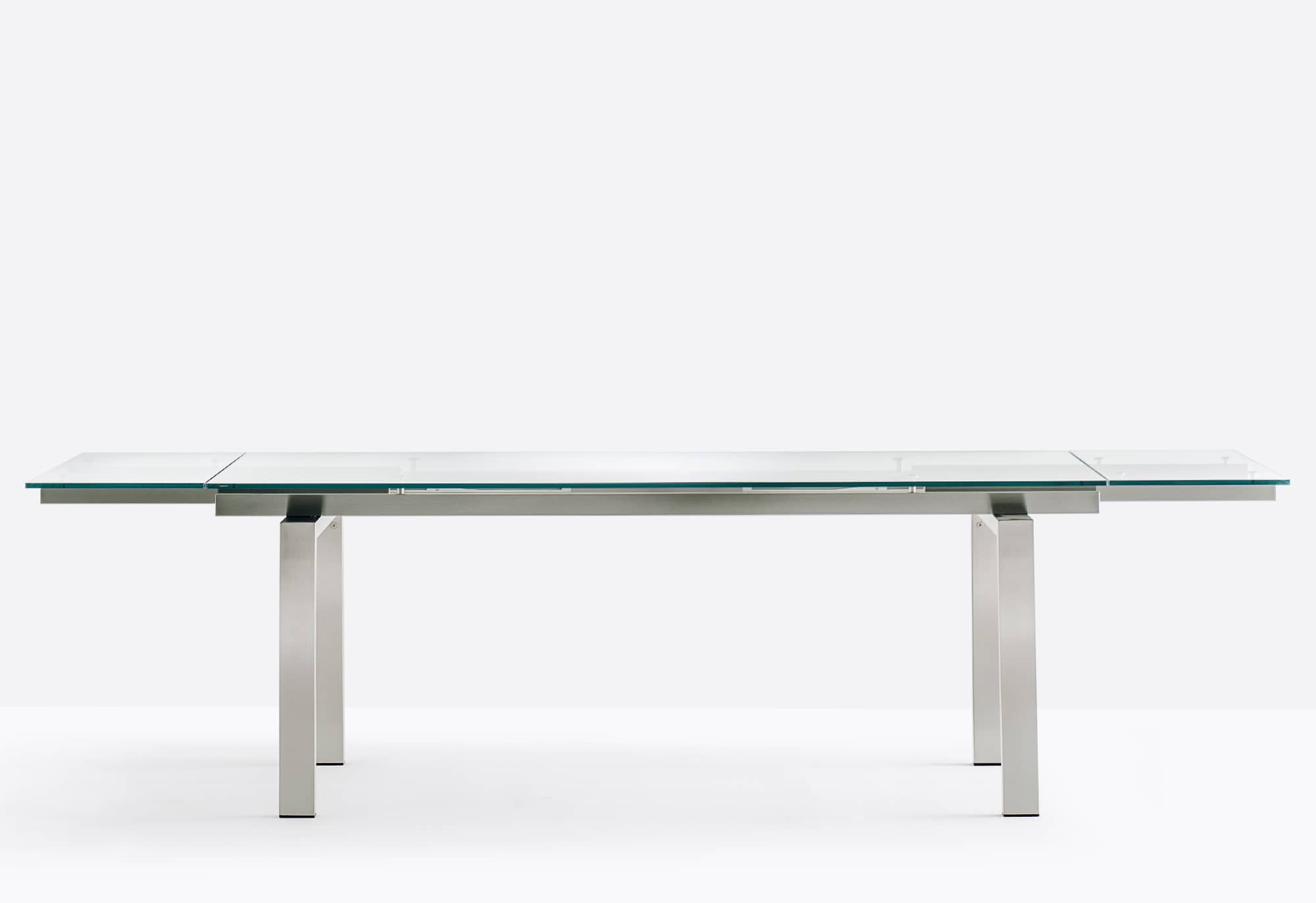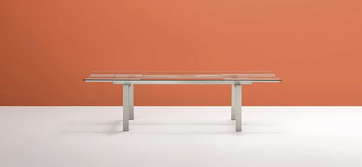 Magic is characterized by a game of transparencies and lenghts and this table complete the surrounding space: from a meeting room to a contemporary living room. Extensible table with brushed stainless steel frame and glass top available in different sizes and finishes.