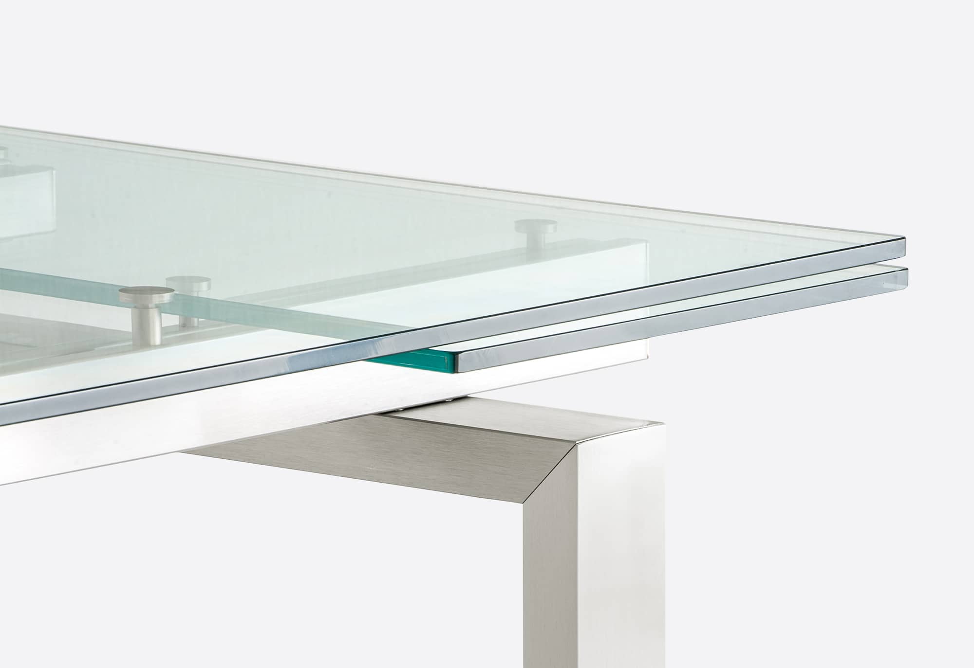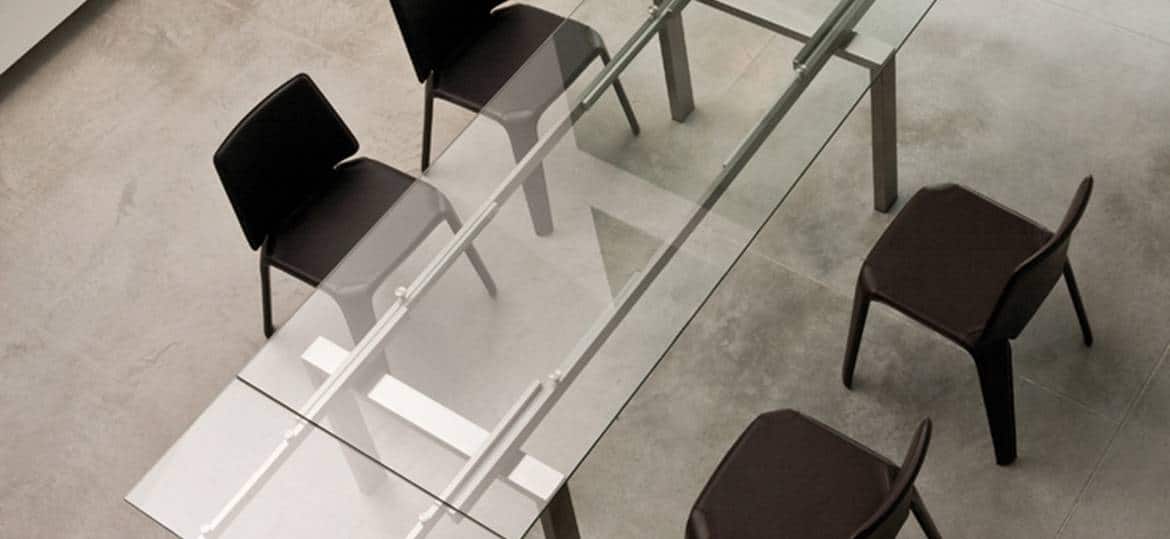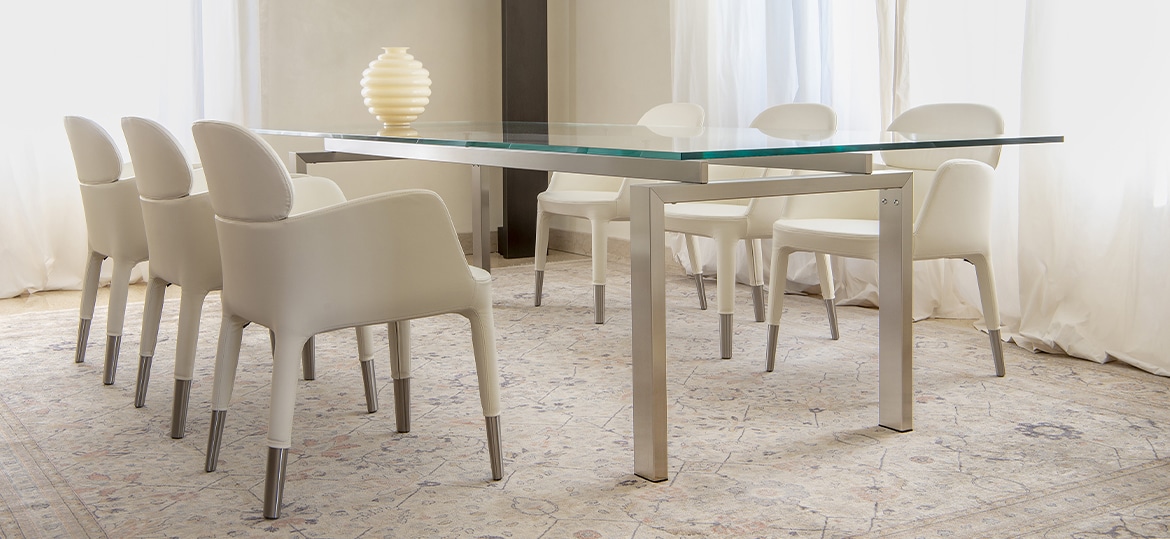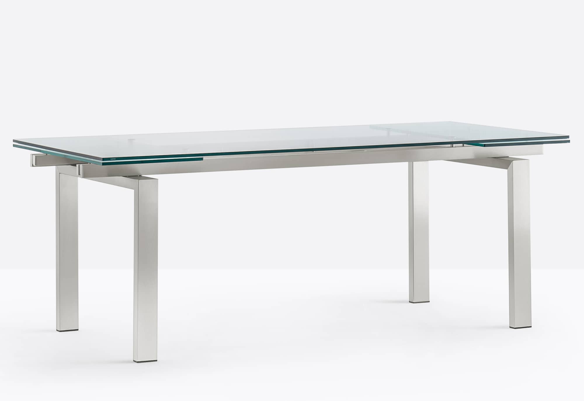 Magic is characterized by a game of transparencies and lenghts and this table complete the surrounding space: from a meeting room to a contemporary living room. Extensible table with brushed stainless steel frame and glass top available in different sizes and finishes.