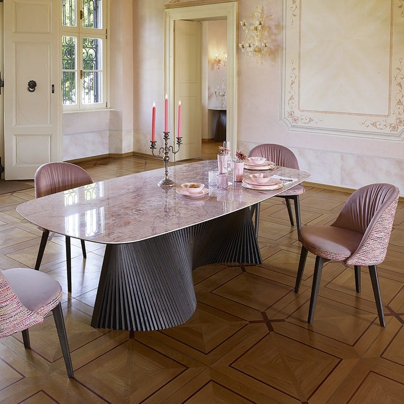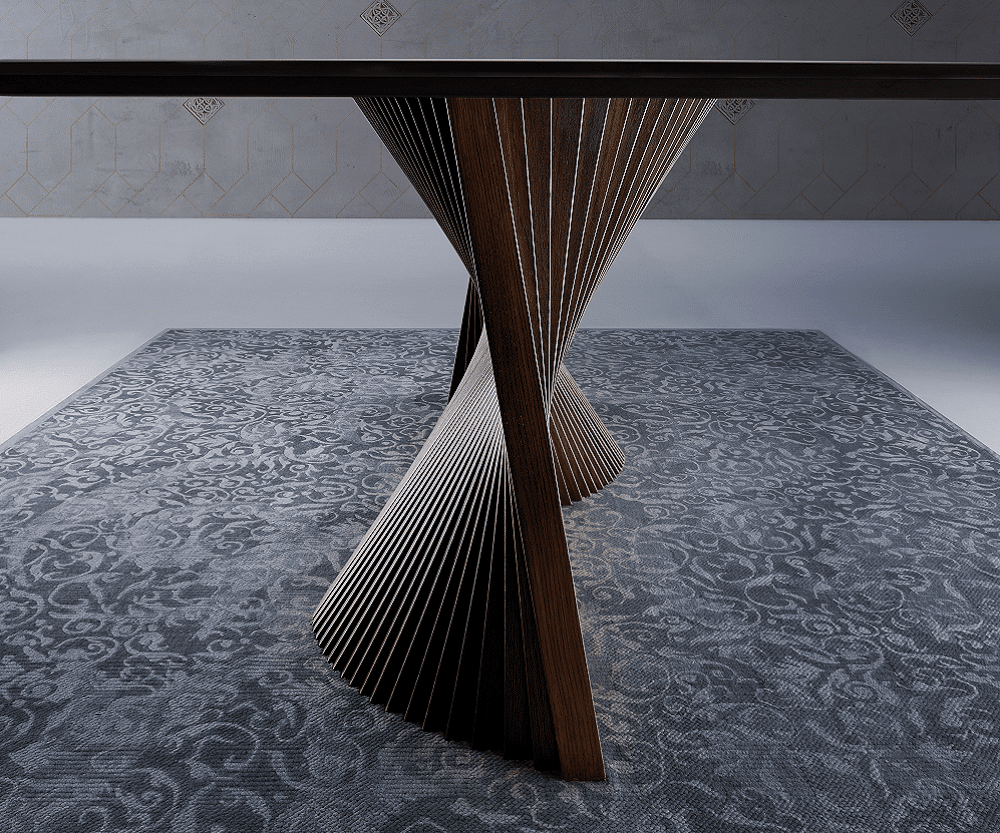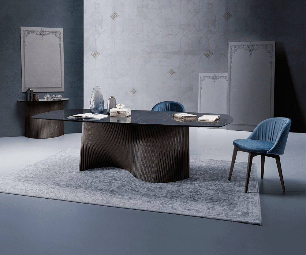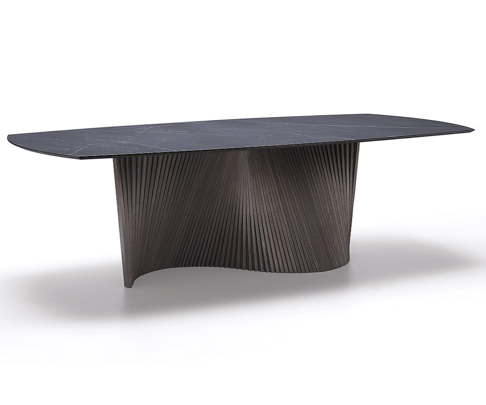 Seen from above, the base recalls the fascinating lunar orbit, hence its name. Three ash wood finishes are available for the base that is made up of over 70 strips. The top, however, can either be glass or shiny and matt ceramic.