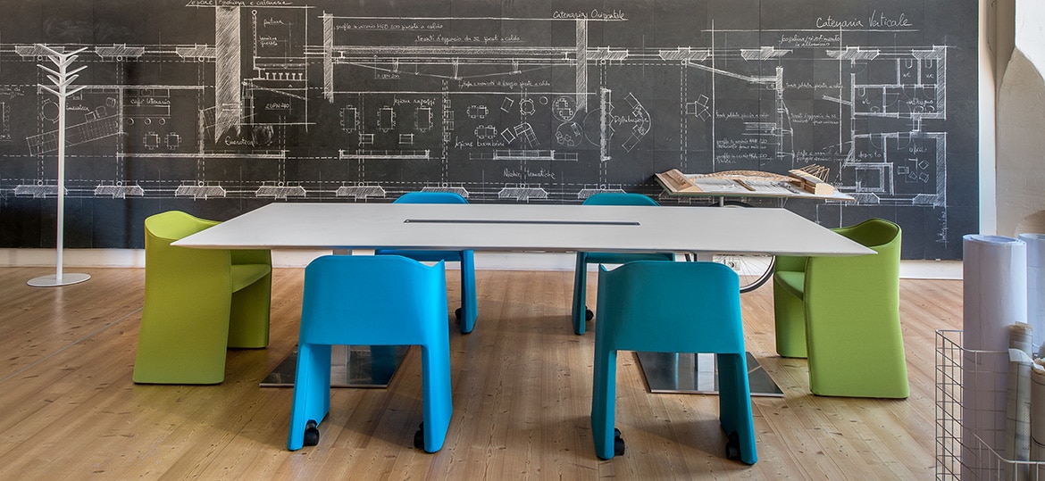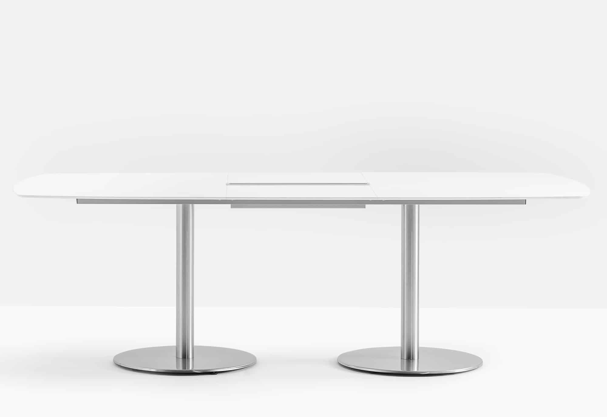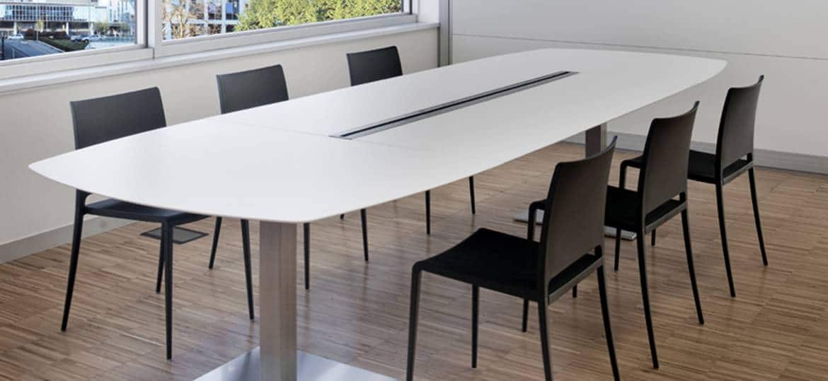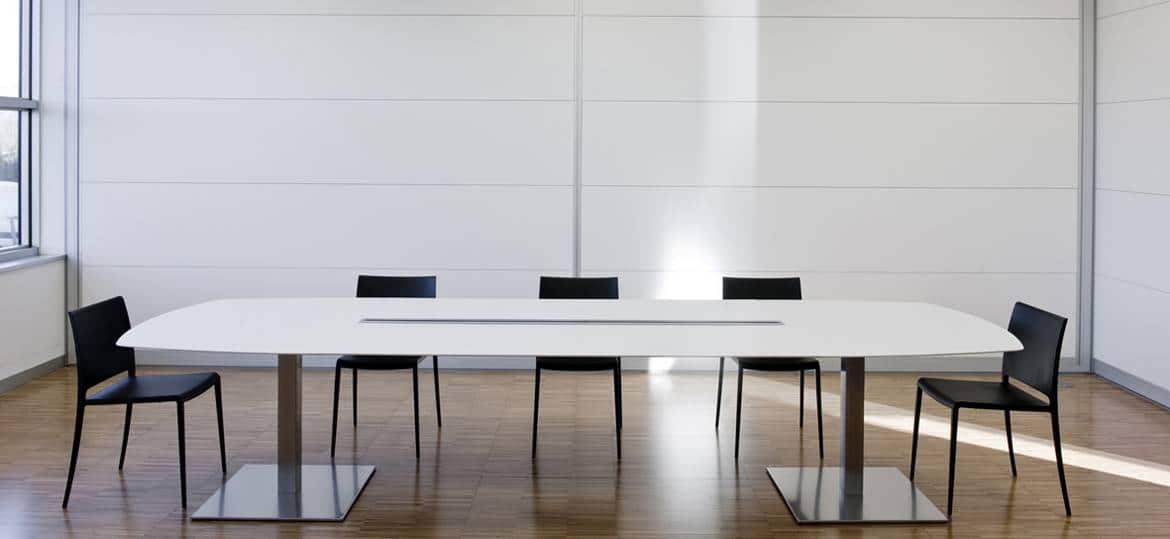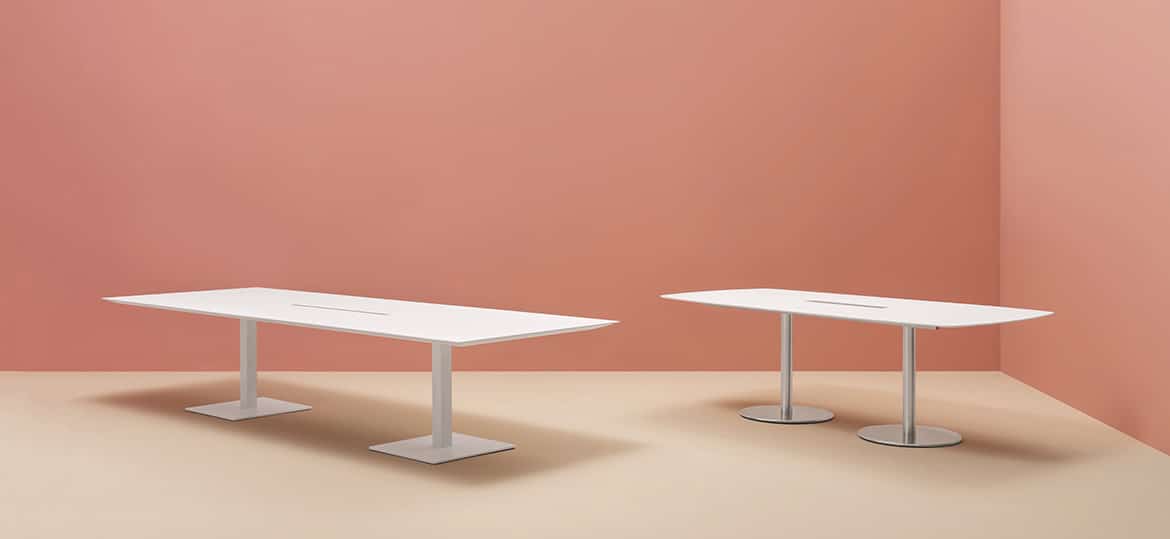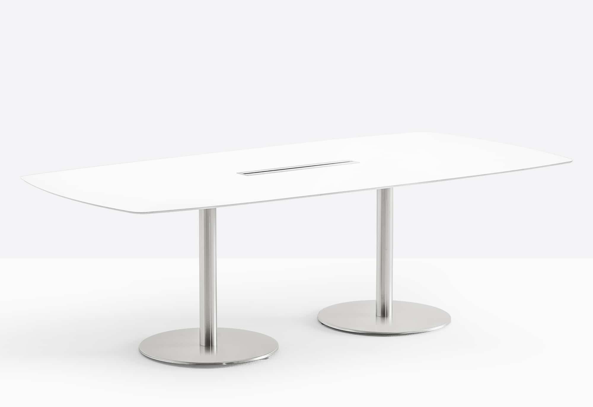 Plano is a collection of tables for the office that satisfies the aesthetic and functional needs of contemporary work environments. Table available in different sizes with two round or square steel bases and oval or rectangular solid laminate top. Also available with the cable management.