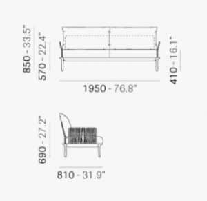 Reva Twist is an outdoor collection with smooth lines and generous sizes. Three-seater sofa with four tapered legs in die-cast aluminium placed at the extremities of the perimeter frame in extruded aluminium. The steel backrest and armrests are woven with a flat rope in weather-resistant polypropylene. Polyester cushions upholstered in fabric.