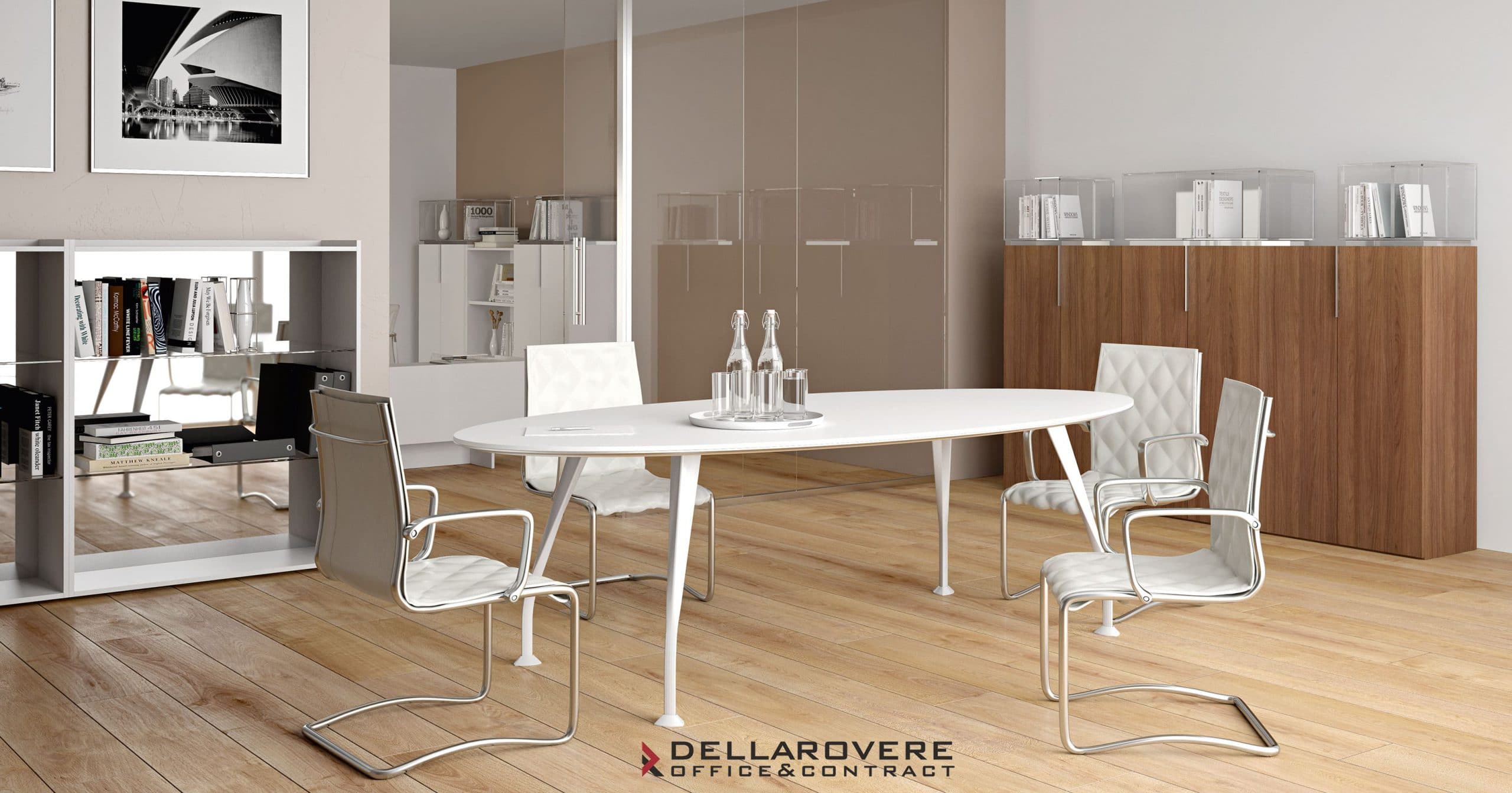 Della Rovere proposes Meeting table designed especially for you. Materials, shapes, dimensions, accessories and legs may be modelled around your company to furnish your Meeting table rooms just the way you want them. We realise your ideas and personalise the Meeting Rooms of your dreams: futuristic, essential, classic and functional. Choose the world of Della Rovere, choose UniMeeting meeting table. The new UniMeeting collection is the result of Della Rovere’s consolidated experience over the years in the world of Office Furniture: the transversal solution to the Della Rovere collections that proposes functionality, design and elegance in the Meeting Rooms. Already in the Research and Development phase we decided to create personalisable writing desks, to give a wide selection of materials and to solve the daily furnishing problems thanks to a vast selection of shapes, colours and the modularity of the tops. Today, different options come together for a result which is always elegant and never banal. Thanks to the furnishing we propose, the Meeting Room becomes a pleasant meeting place with an essential, geometric style, a pure symbol of professionalism. The large tops are supported by solid bases harmonious in form and with great visual impact. It’s easy to be instantly operative: a click opens the cabling system panels. Functionality is always supported by the beauty of the materials and the equilibrium of a simple and elegant design which does not pass unobserved.