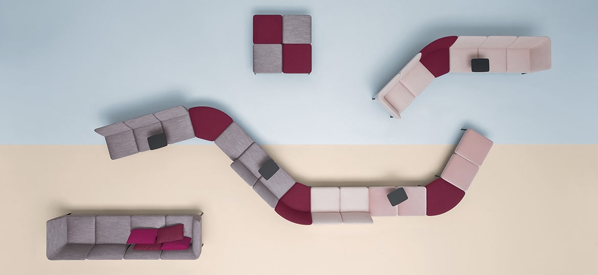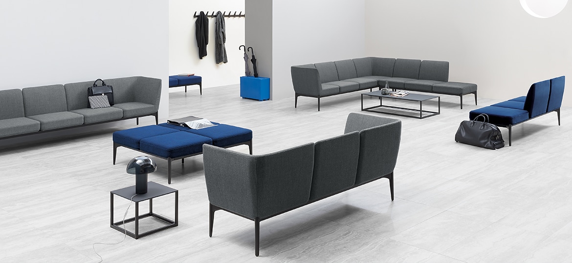Social is a modular system of linear, corner, curved seatings and poufs that can be matched to create an endlessy replicable sofa ready to host sociable moments. Modular system with two, three or four poufs in polyurethane foam, steel frame and die-casted aluminium legs at the far ends.