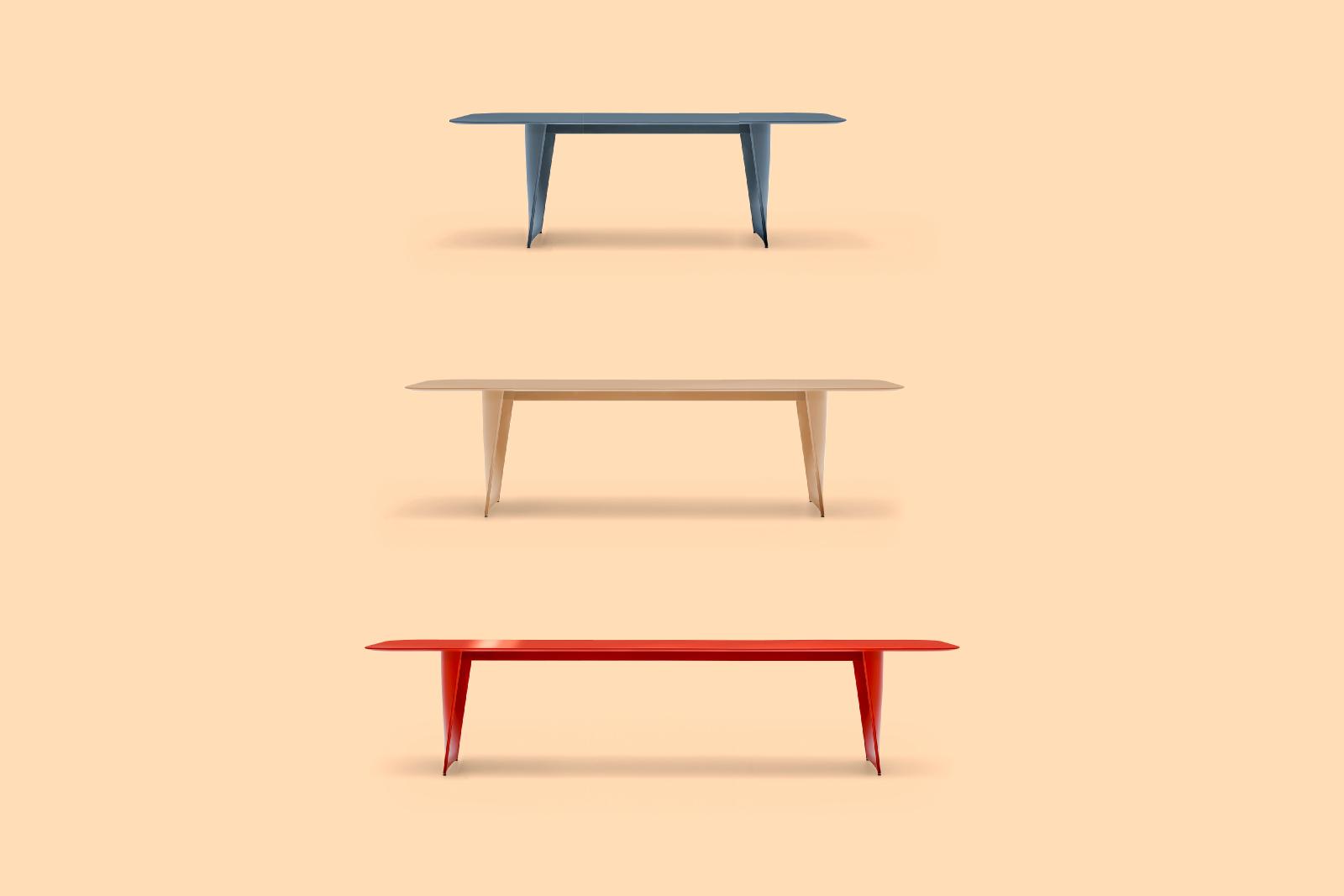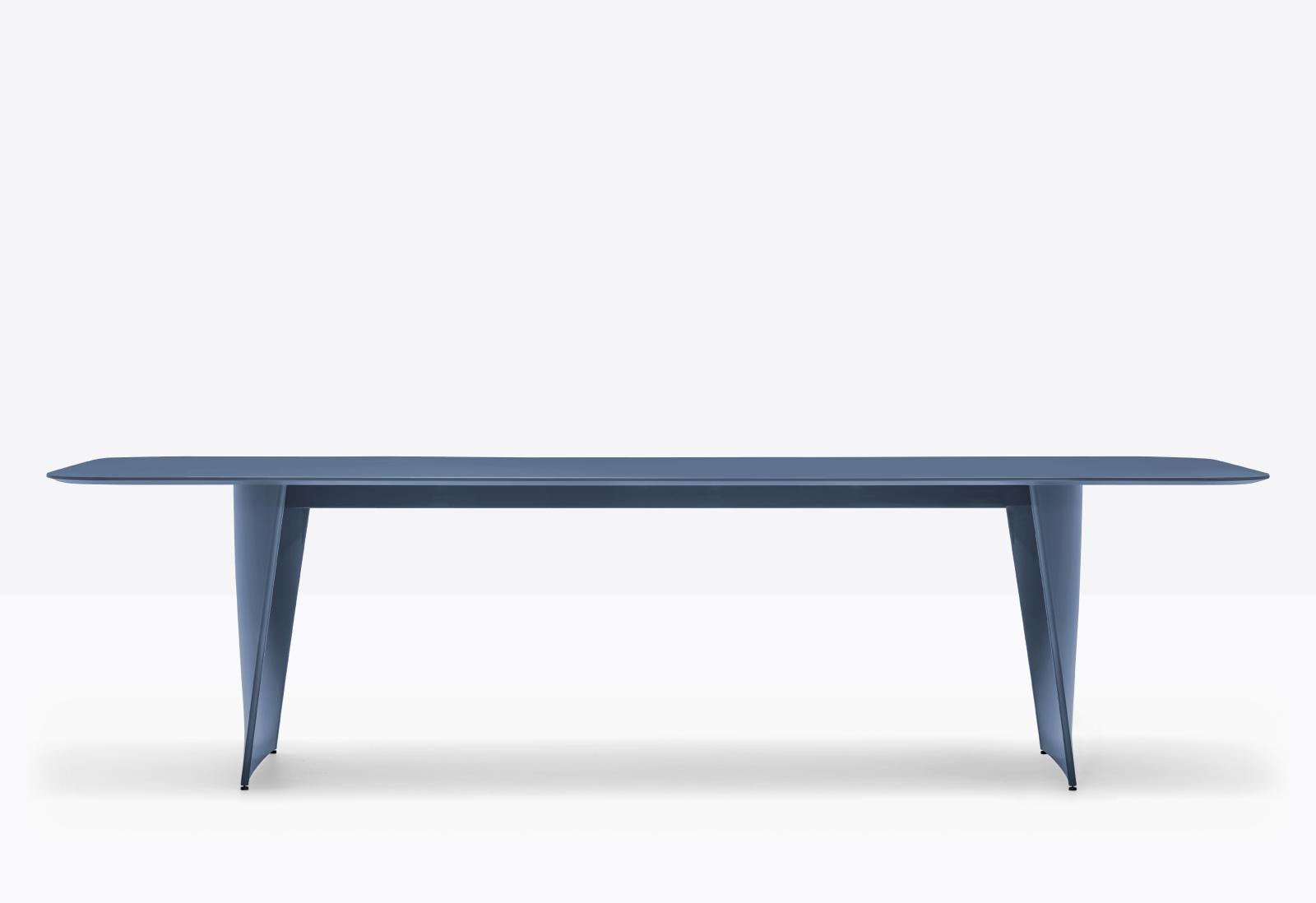 שולחן הפרנק (Frank) בצבע כחול מעוצב בהשראה ארכיטקטונית תוך שימוש בחומרים תעשייתיים איכותיים, ומשלב בצורה הרמונית בין קווים רציונליים לקימורים עדינים ליצירת מראה קליל ועכשווי. השולחן בנוי משתי רגליים עשויות אלומיניום יצוק בעובי משתנה המתחדד כלפי מטה בקימור מעודן, המחוברות באמצעות קורת פלדה חזקה התומכת במשטח המלבני עם פינות מעוגלות הזמין במגוון חומרים וגימורים, ומעניק לשולחן מראה תעשייתי מתוחכם שמשתלב היטב בחללים מודרניים.