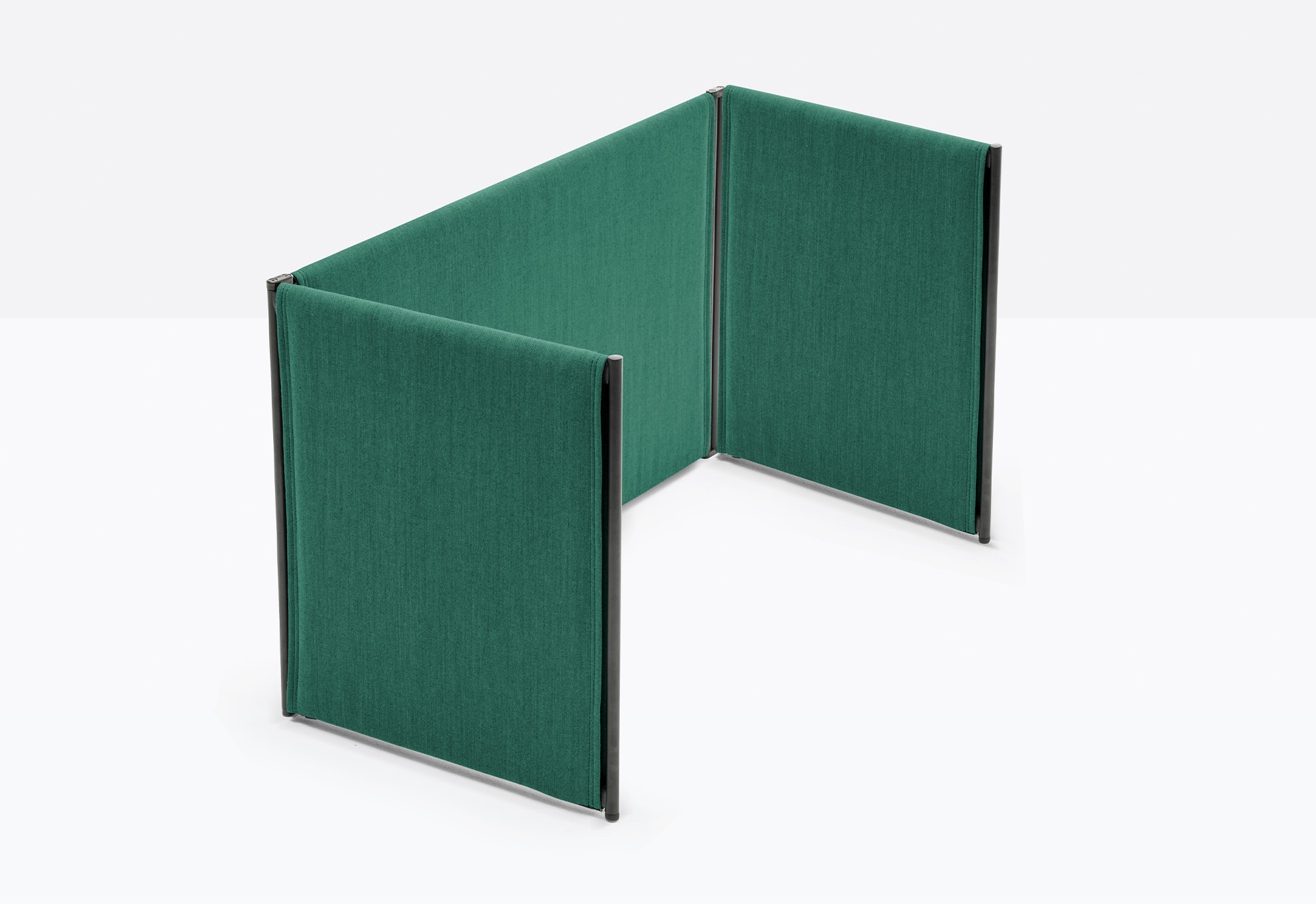 The Toa Folding Screen is a sound absorbing desktop panel that separates and defines spaces. Designed to meet the mobility and layout requirements of modern work spaces, it also responds to current social distancing needs. The inner metal structure is upholstered in fabric with a zip that makes it easy to remove, clean and maintain. Given that it is extremely lightweight, the screen can be folded with ease and moved from one place to another.